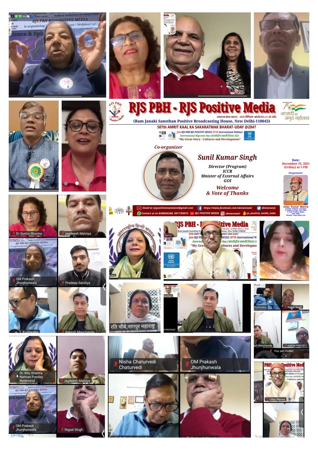 नई दिल्ली/उमा सक्सेना/- अंतरराष्ट्रीय प्रवासी दिवस के अवसर पर राम जानकी संस्थान पॉजिटिव ब्रॉडकास्टिंग हाउस (RJS PBH) द्वारा आयोजित 507वें कार्यक्रम में वैश्विक प्रवासी भारतीयों की भूमिका, संघर्ष और योगदान पर गहन चर्चा की गई। 19 दिसंबर 2025 को आयोजित इस विशेष आयोजन का विषय “माई ग्रेट स्टोरी, कल्चर एंड डेवलपमेंट” रहा, जिसमें दुनिया के विभिन्न देशों से जुड़े प्रवासी वक्ताओं ने अपने अनुभव साझा किए।