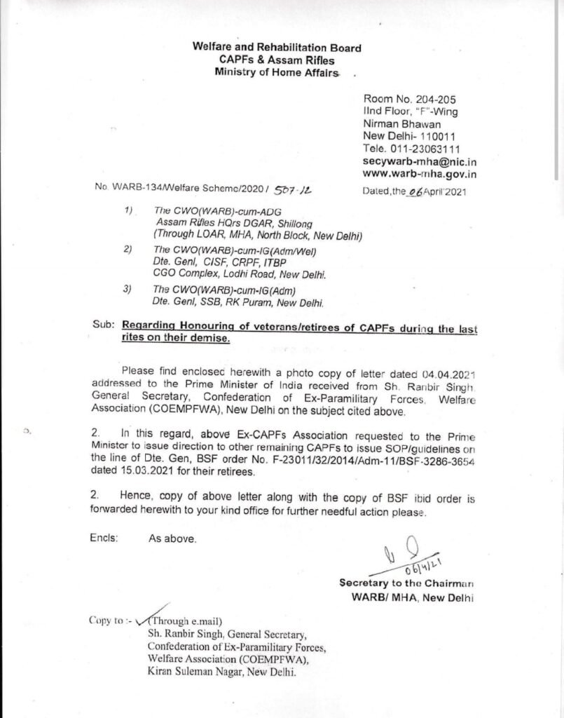 नई दिल्ली/- रिटायर्ड अर्द्धसैनिको के लिए मरणोपरांत सलामी सम्मान के प्रावधान वास्ते कॉनफैडरेसन महासचिव रणबीर सिंह द्वारा 4 अप्रैल 2021 को लिखी गई चिट्ठी का यशस्वी प्रधानमंत्री जी द्वारा वेलफेयर एंड रिहिबिलेटसन बोर्ड (वार्ब) गृह मंत्रालय को तुरंत संज्ञान लेने व आवश्यक कार्यवाही हेतू आदेश जारी करने को कहा गया है जिसके एवज में माननीय वार्ब चेयरमैन द्वारा सभी फोर्सेस डायरेक्टर जनरल को आखिरी सलामी सम्मान निर्देश जारी किए जाने हेतू कहा गया।