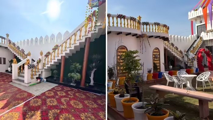 घर की बाहरी सीढ़ियां और छत का हिस्सा महल जैसा एहसास कराता है। सफेद दीवारों के साथ सुनहरी रेलिंग वाली सीढ़ियां ऊपर की ओर जाती हैं, जिन्हें गृह प्रवेश के दौरान फूलों की मालाओं से सजाया गया था। छत के किनारे पर बने कंगूरे और गुंबद पारंपरिक राजपूत वास्तुकला की याद दिलाते हैं।