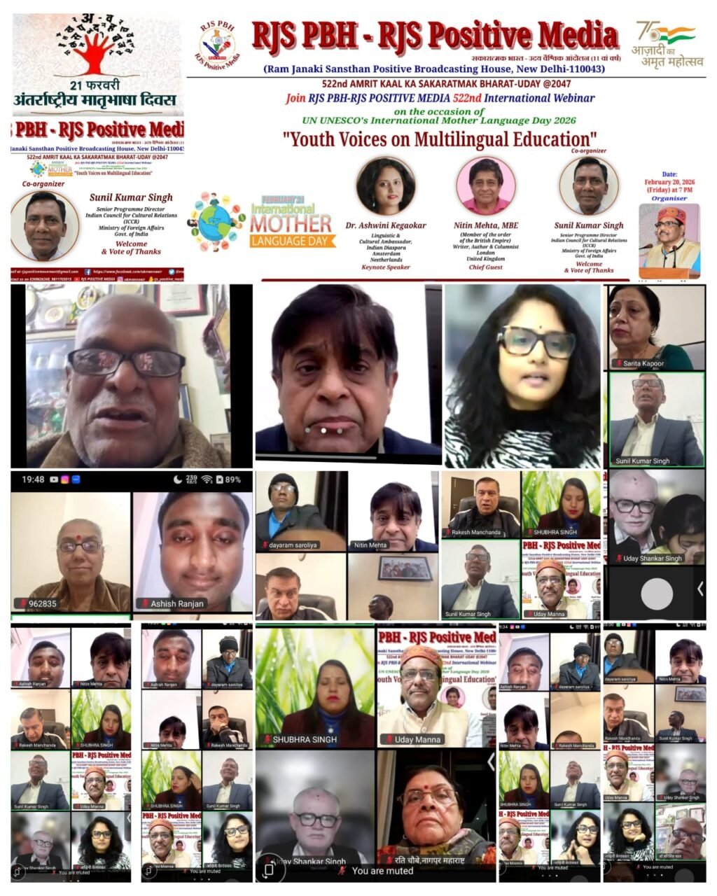 नई दिल्ली/उमा सक्सेना/-   अंतरराष्ट्रीय मातृभाषा दिवस की पूर्व संध्या पर राम जानकी संस्थान पॉजिटिव ब्रॉडकास्टिंग हाउस (आरजेएस पीबीएच) और आरजेएस पॉजिटिव मीडिया के संयुक्त तत्वावधान में आयोजित 522वें वेबिनार में देश-विदेश के विशेषज्ञों ने मातृभाषा के महत्व पर व्यापक चर्चा की। यूनाइटेड किंगडम, नीदरलैंड और भारत के विभिन्न राज्यों से जुड़े प्रतिभागियों ने एक स्वर में कहा कि मातृभाषा केवल संवाद का माध्यम नहीं, बल्कि मानसिक विकास की बुनियाद और वैश्विक स्तर पर सांस्कृतिक प्रभाव का सशक्त साधन है।