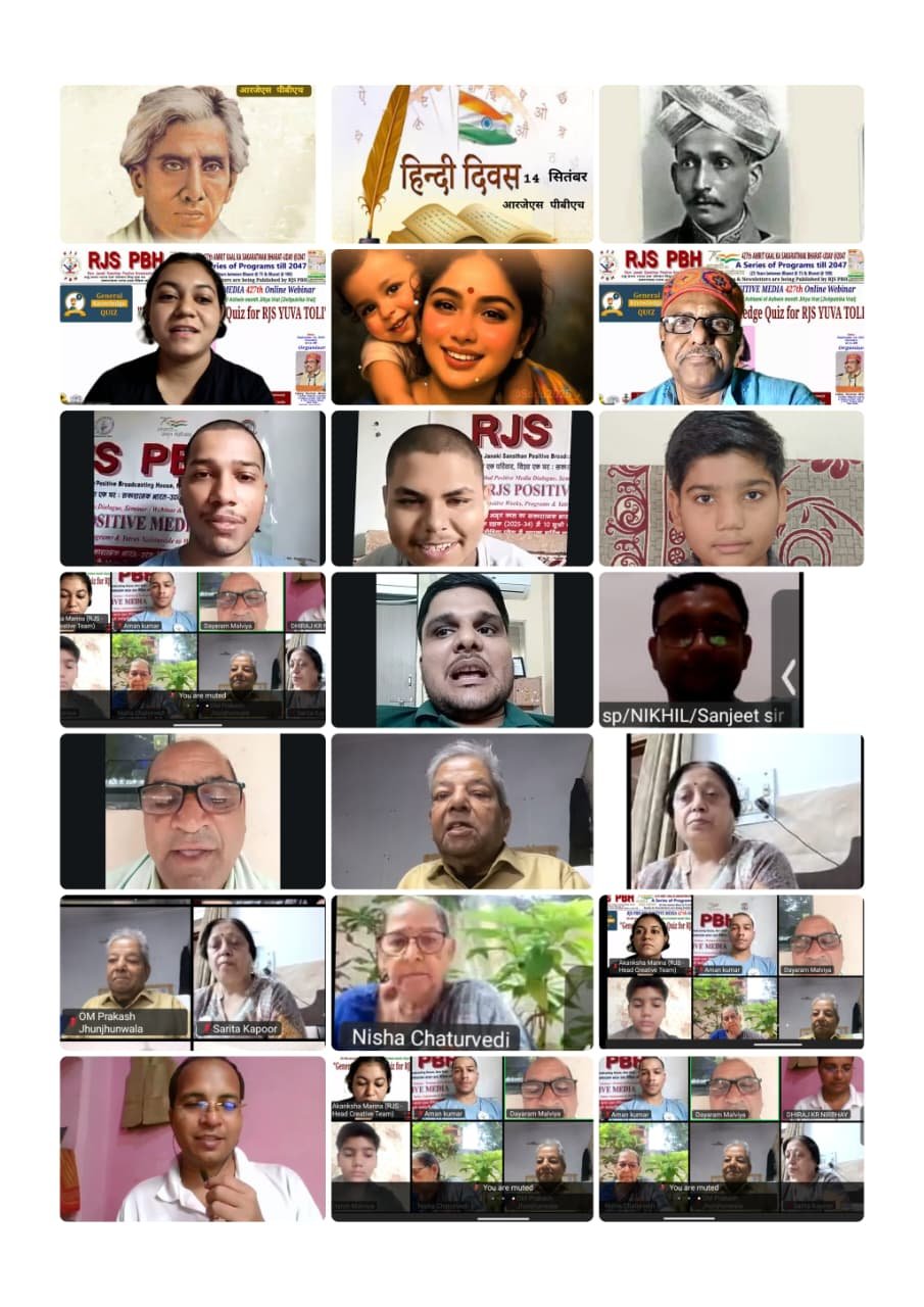 नई दिल्ली/उमा सक्सेना/-    राम जानकी संस्थान पॉजिटिव ब्रॉडकास्टिंग हाउस (आरजेएस पीबीएच) और आरजेएस पॉजिटिव मीडिया ने अपने 427वें ऑनलाइन कार्यक्रम के तहत युवाओं के समग्र विकास और ज्ञानवर्धन को समर्पित एक विशेष क्विज़ प्रतियोगिता का आयोजन किया। इस मौके पर आकांक्षा मन्ना ने कार्यक्रम का संचालन किया और हिंदी दिवस की शुभकामनाएँ देते हुए दो दौर की रोचक प्रश्नोत्तरी कराई। क्विज़ में दिल्ली, पटना, जमशेदपुर और उज्जैन से जुड़े प्रतिभागियों ने शानदार प्रदर्शन किया।