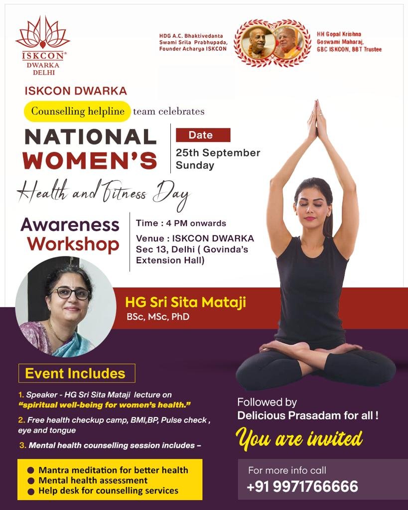श्री श्री रुक्मिणी द्वारकाधीश मंदिर ने महिलाओं के स्वास्थ्य के लिए शारीरिक, मानसिक और आध्यात्मिक कल्याण को बढ़ावा देने के लिए पहली बार 25 सितंबर, रविवार को “राष्ट्रीय महिला स्वास्थ्य और फिटनेस दिवस“ कार्यशाला कार्यक्रम आयोजित किया। उन्होंने बेहतर स्वास्थ्य और फिटनेस के बारे में जागरूकता फैलाने के लिए परामर्श सत्र प्रदान करके मानसिक स्वास्थ्य देखभाल पर अधिक जोर देते हुए मंत्र ध्यान और मानसिक स्वास्थ्य आकलन साझा करने के साथ-साथ सभी के लिए मुफ्त स्वास्थ्य जांच शिविर भी लगाया। इस कार्यक्रम में सभी के लिए स्वादिष्ट प्रसादम भी शामिल था!