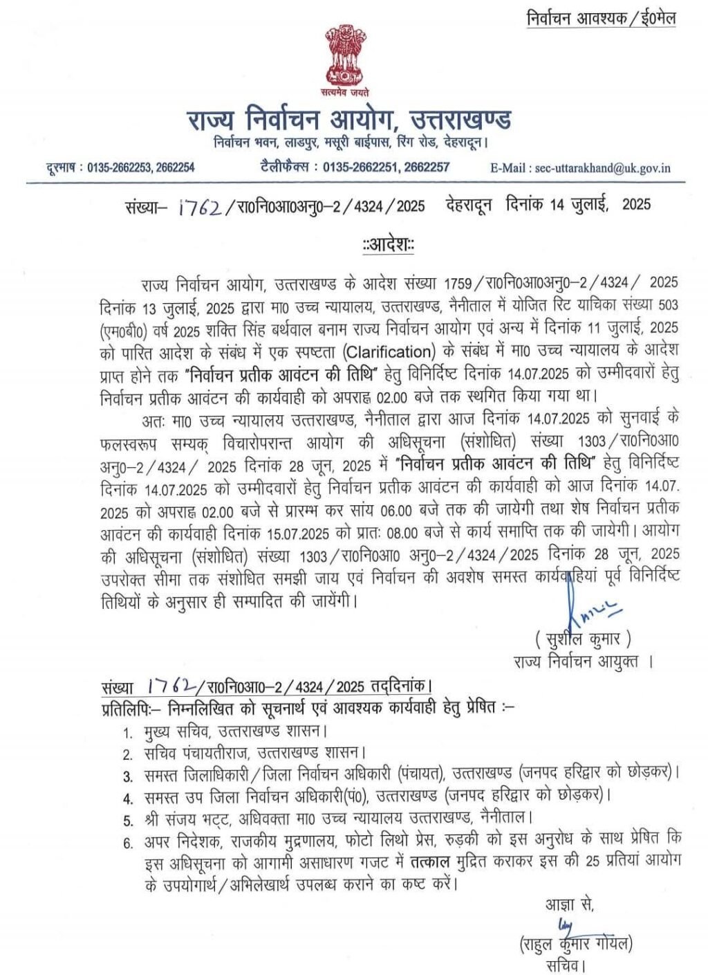देहरादून/अनीशा चौहान/- नैनीताल हाईकोर्ट में आज हुई सुनवाई के बाद राज्य निर्वाचन आयोग ने स्पष्ट कर दिया है कि पंचायत चुनाव की प्रक्रिया पूर्व में जारी अधिसूचना के अनुसार ही संपन्न कराई जाएगी। इस संबंध में आयोग ने चुनाव चिन्ह आवंटन को लेकर भी दिशा-निर्देश जारी कर दिए हैं।