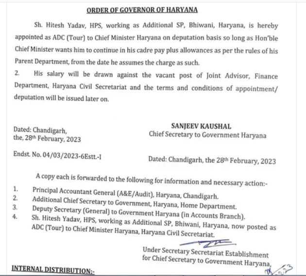 हरियाणा के मुख्य सचिव संजीव कौशल की ओर से मंगलवार देर रात हितेश यादव की तैनाती को लेकर ऑर्डर जारी किए गए।