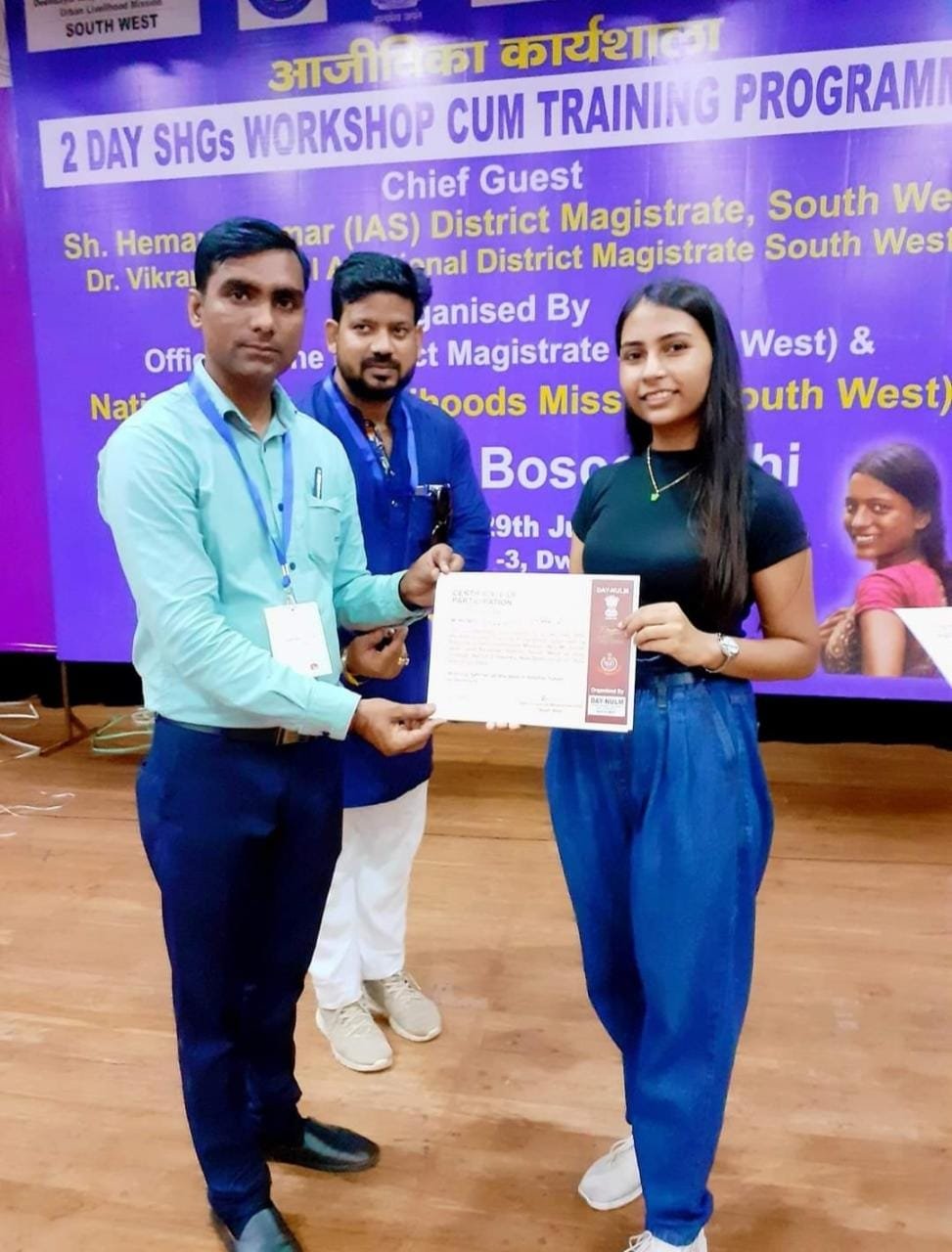 नवीन कोटिया, एवं संदीप गुडियाल, रूचि अधिकारी, द्वारा सभी समूह की महिलाओ को सहभागी प्रमाण पत्र दिए गए। आजीविका कार्यशाला में कुछ समूहों द्वारा अपने हैंडमेड उत्पादों की स्टाल लगा कर पर्दशनी भी लगाई गई। साथ ही कार्यक्रम के अंतिम दिन मे सभी लोगो को रेड क्रॉस सोसाइटी की तरफ से स्वच्छता किट वितरित की गयी। कार्यक्रम को बहुत से मीडिया हॉउस ने अपना कवरेज दिया जिसमें नजफगढ़ मैट्रों न्यूज का सहयोग सराहनीय रहा। कार्यक्रम में विशेष योगदान लवलीन, अनिल, विनोद, अरबाज खान, तेजेंद्र, राहुल अधिकारी व सिविल डिफेंस स्वयं सेवको का रहा।और इस तरह ग्रुप फोटो की यादों के साथ यह कार्यक्रम सम्पन्न हुआ।