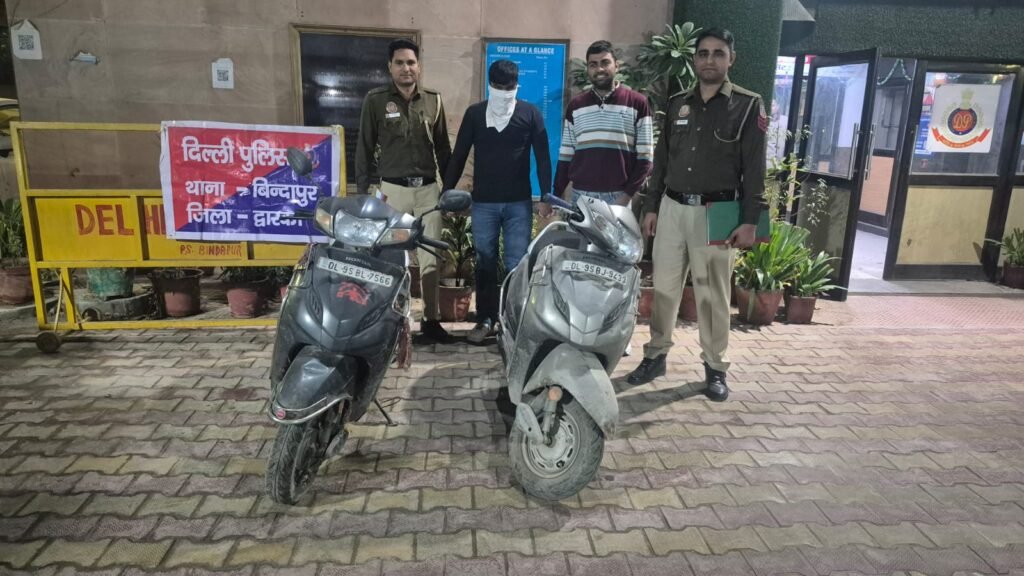 नई दिल्ली/बिंदापुर/उमा सक्सेना/- बिंदापुर पुलिस की क्रैक टीम ने एक कुख्यात अपराधी जावेद (32) को गिरफ्तार किया है, जो पिछले कई महीनों से बिंदापुर क्षेत्र में स्कूटी और मोटरसाइकिल की चोरी कर रहा था। जावेद पर पहले से ही 74 से अधिक मामलों में संलिप्त होने का आरोप है और वह PS रानहोल का बीसी (बैलिवेबल क्रिमिनल) भी माना जाता है।