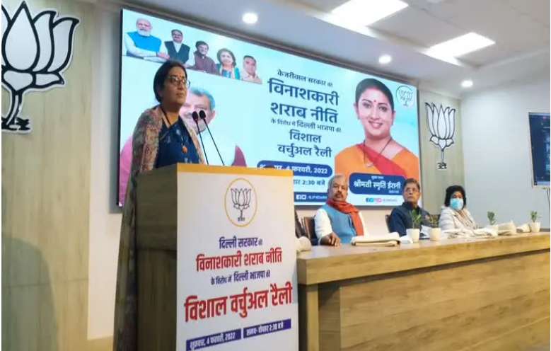 केंद्रीय मंत्री स्मृति ईरानी ने वर्चुअल रैली के माध्यम से न सिर्फ से सीधे दिल्ली की जनता से संपर्क साधा, बल्कि शराब की आबकारी नीति को लेकर दिल्ली के मुख्यमंत्री अरविंद केजरीवाल को जमकर खरी-खरी सुनाई। केंद्रीय मंत्री ने कहा कि दिल्ली के मुख्यमंत्री अरविंद केजरीवाल ने दिल्ली की जनता को शराब के नशे में झोंकने का काम कर रहे हैं। आज दिल्ली के अंदर स्कूल और धार्मिक जगहों के पास शराब के ठेके खोले जा रहे हैं. जो बिल्कुल गलत है।उन्होने अपने भाषण में नजफगढ़ तीन सरकारी स्कूलों के पास शराब का ठेका खोलने का भी जिक्र किया।