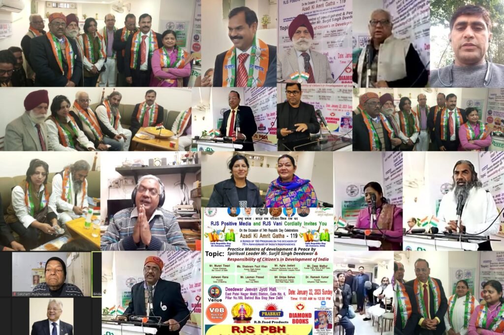 नजफगढ़ मैट्रो न्यूज/द्वारका/शिव कुमार यादव/- भारत सरकार के आजादी का अमृत महोत्सव की कड़ी में 74वें गणतंत्र दिवस के अवसर राम जानकी संस्थान, आरजेएस और आरजेएस पॉजिटिव ब्रॉडकास्टिंग हाउस ने आजादी की अमृत गाथा की 119 वीं बैठक साउथ पटेल नगर स्थित दीदेवार जीवन ज्योति हॉल में आयोजित की। कार्यक्रम की शुरुआत करते हुए आरजेएस ऑब्जर्वर और पूर्व ओएसडी, दिल्ली सरकार दीपचंद माथुर ने सभी वर्चुअल रूप से और साक्षात हाजिर सज्जनों का स्वागत किया और आरजेएस के सकारात्मक भारत-उदय आंदोलन पर प्रकाश डाला। उन्होंने स्वयं आजादी की अमृत गाथा के दो अंक आयोजित करने की घोषणा की। आज के सह-आयोजक अध्यात्म योग संस्थान के संस्थापक डा.रमेश कुमार ने मंत्रोच्चार के साथ ऑनलाइन संबोधित कर जीवन में योग और सकारात्मकता अपनाने की सलाह दी।