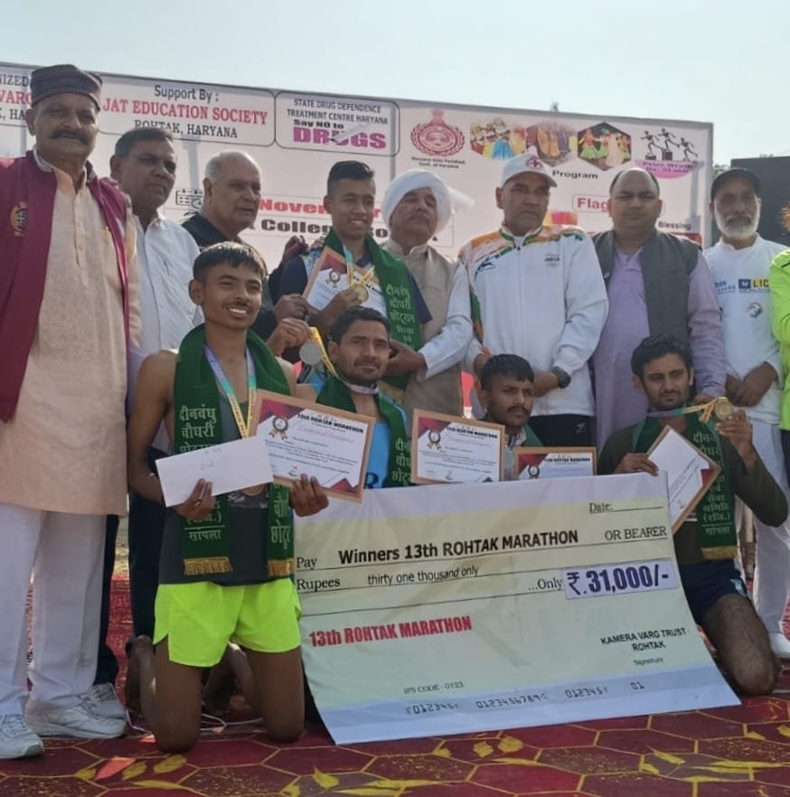 वहीं, नरेंद्र जांगड़ा ने रोहतक के जाट कॉलेज से सांपला तक आयोजित सर चौधरी छोटू राम की जयंती के उपलक्ष्य में 21 किलोमीटर ओपन वर्ग में चौथा स्थान प्राप्त कर 5100 रुपये जीते। बह्म प्रकाश मान ने आयु वर्ग में पहला और ओपन में दसवां स्थान हासिल किया, जिन्हें मोमेंटो देकर सम्मानित किया गया। नसीब चंद और बिजेंद्र ने सफलतापूर्वक दौड़ पूरी की।