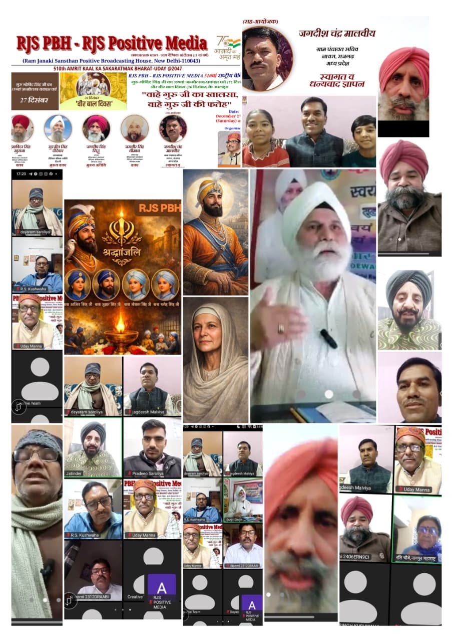 नई दिल्ली/उमा सक्सेना/-     सिखों के दसवें गुरु श्री गुरु गोविंद सिंह जी के 359वें प्रकाश पर्व और वीर बाल दिवस के अवसर पर राम जानकी संस्थान पॉजिटिव ब्रॉडकास्टिंग हाउस (आरजेएस पीबीएच) एवं आरजेएस पॉजिटिव मीडिया द्वारा एक विशेष वेबिनार का आयोजन किया गया। यह आरजेएस का 510वां वेबिनार था, जिसे मध्य प्रदेश के नायरा राजगढ़ से ग्राम पंचायत सचिव जगदीश चंद्र मालवीय के सहयोग से आयोजित किया गया। कार्यक्रम में गुरु गोविंद सिंह जी के चार साहिबजादों के अद्वितीय बलिदान को श्रद्धा और सम्मान के साथ याद किया गया।