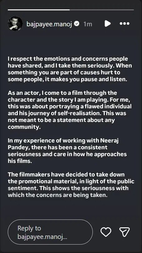 मनोज बाजपेयी ने सोशल मीडिया के जरिए बयान जारी करते हुए कहा कि वह दर्शकों की भावनाओं और चिंताओं को पूरी गंभीरता से लेते हैं। उन्होंने स्पष्ट किया कि एक कलाकार के तौर पर उनका उद्देश्य किसी समुदाय या वर्ग की छवि को ठेस पहुंचाना नहीं है, बल्कि वह सिर्फ अपने किरदार और कहानी तक सीमित रहते हैं। उनके मुताबिक फिल्म की कहानी एक ऐसे व्यक्ति के इर्द-गिर्द घूमती है, जो गलत रास्तों पर चलता है और फिर आत्मबोध की यात्रा से गुजरता है। यह पूरी तरह एक काल्पनिक कथा है, जिसका किसी जाति, धर्म या समाज से कोई सीधा संबंध नहीं है।