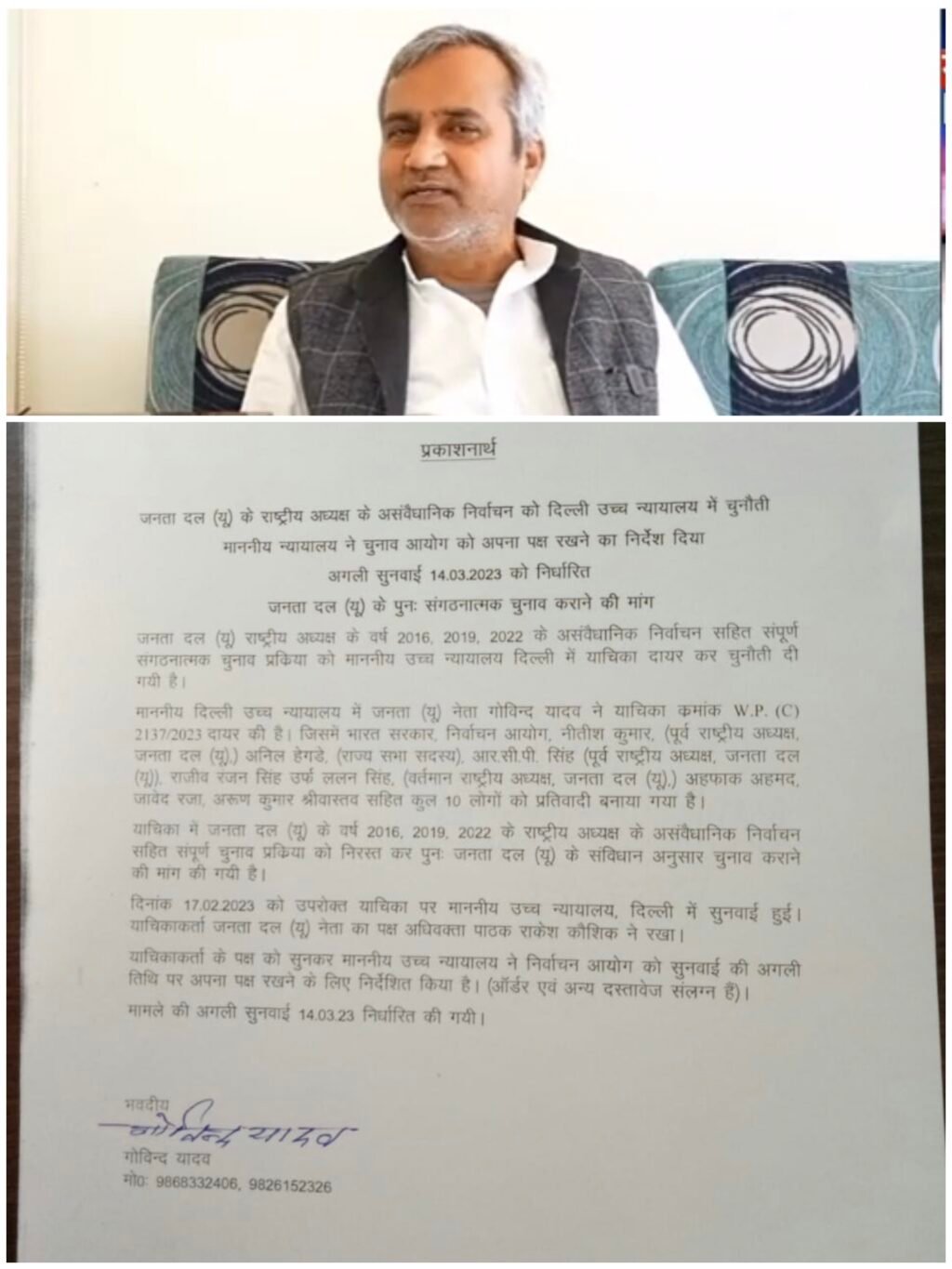 माननीय दिल्ली उच्च न्यायालय में जनता (यू) नेता गोविंद यादव ने याचिका क्रमांक डब्ल्यू पी सी) 2137/2023 दायर की है। जिसमें भारत सरकार, निर्वाचन आयोग, नीतीश कुमार, (पूर्व राष्ट्रीय अध्यक्ष), जनता दल (यू) अनिल हेगड़े, (राज्य सभा सदस्य) ,आर.सी.पी. सिंह (पूर्व राष्ट्रीय अध्यक्ष), जनता दल(यू) राजीव रंजन सिंह उर्फ ललन सिंह (वर्तमान राष्ट्रीय अध्यक्ष), जनता दल अहफाक अहमद जावेद राज, अरुण कुमार श्रीवास्तव सहित कुल 10 लोगों को प्रतिवादी बनाया गया है। याचिका में जनता दल (यू) राष्ट्रीय अध्यक्ष के वर्ष 2016, 2019, 2022 के असंवैधानिक निर्वाचन साहित संपूर्ण संगठनात्मक चुनाव प्रक्रिया को माननीय उच्च न्यायालय दिल्ली में चुनौती दी गयी है। साथ ही याचिका में जनता दल (यू) के वर्ष 2016, 2019, 2022 के राष्ट्रीय अध्यक्ष के असंवैधानिक निर्वाचन सहित संपूर्ण चुनाव प्रक्रिया को निरस्त कर पुनः जनता दल (यू) के संविधान अनुसार चुनाव कराने की मांग की गयी है।