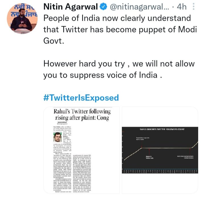 इन आरोपों पर कईं कांग्रेसी नेता राहुल गांधी का समर्थन करते हुए, नरेंद्र मोदी के खिलाफ बोलते दिखाई दे रहे थे। उन्हीं में से हमेशा अपनी बातों और कार्यों की वजह से विवाद में रहने वाले, राजस्थान के प्रवक्ता, राष्ट्रिय सह संयोजक(डिजीटल एंड सोशल मीडिया) “नितिन अग्रवाल” ने इन आरोपों को सही बताते हुए,” ट्विटर को मोदी का पालतू बताया है, उन्होंने अपने इस ट्वीट में एक ग्राफ के साथ लिखी हुई न्यूज़ साझा की है और अपनी इस ट्वीट में चुनौतीपूर्ण शब्दों में लिखा है कि, “कितना भी कुछ कर लो, हम दबे हुए भारत की आवाज को नहीं दबने देंगे।” इससे पहले राहुल गांधी ने अपनी एक ट्वीट मे कुछ तस्वीरें साझा की थी, जिन तस्वीरों में फॉलोअर्स का सीधा-सीधा रुक जाना और मध्यम गति से चलना साफ साफ स्पष्ट हो रहा था, फिर भी उन फोटो या तस्वीरों से नरेन्द्र मोदी या अन्य किसी भाजपा कार्यकर्ता पर इल्जाम स्पष्ट रूप से साबित नहीं हो पा रहे हैं, ऐसे में देखना काफी दिलचस्प होगा इन आरोपों पर भाजपा कार्यकर्ता, कैसी प्रतिक्रिया दिखाते हैं।
