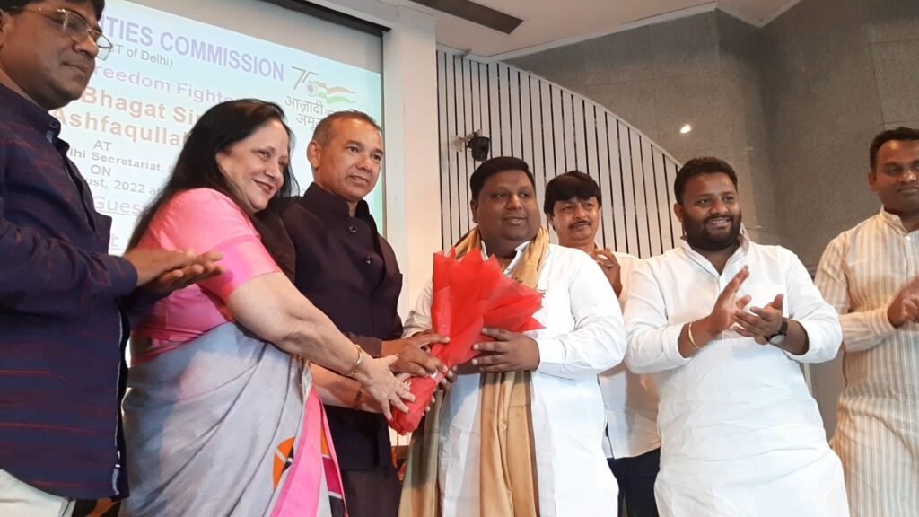 नई दिल्ली/- आजादी के 75 में अमृत महोत्सव के तहत दिल्ली सचिवालय में बुधवार को अल्पसंख्यक आयोग के तत्वाधान में महान स्वतंत्रता सेनानी शहीद भगत सिंह व अशफाक उल्लाह खान की याद में एक सेमिनार का आयोजन किया गया। सेमिनार में उपस्थित मुख्य अतिथि खाद्य एवं आपूर्ति मंत्री इमरान हुसैन व विशिष्ट अतिथि कोंडली विधायक कुलदीप कुमार, त्रिलोकपुरी विधायक रोहित कुमार मेहरोलिया तथा सीलमपुर विधायक अब्दुल रहमान ने दोनों महान स्वतंत्रता सेनानियों को श्रद्धांजलि स्वरुप श्रद्धा सुमन अर्पित किए। अल्पसंख्यक आयोग के चेयरमैन जाकिर खान ने इस अवसर पर सभी अतिथियों का स्वागत किया।