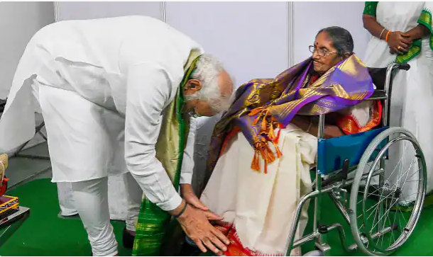 पीएम मोदी ने छुए स्वतंत्रता संग्राम के सेनानी की बेटी के पैर, लिया आशीर्वाद