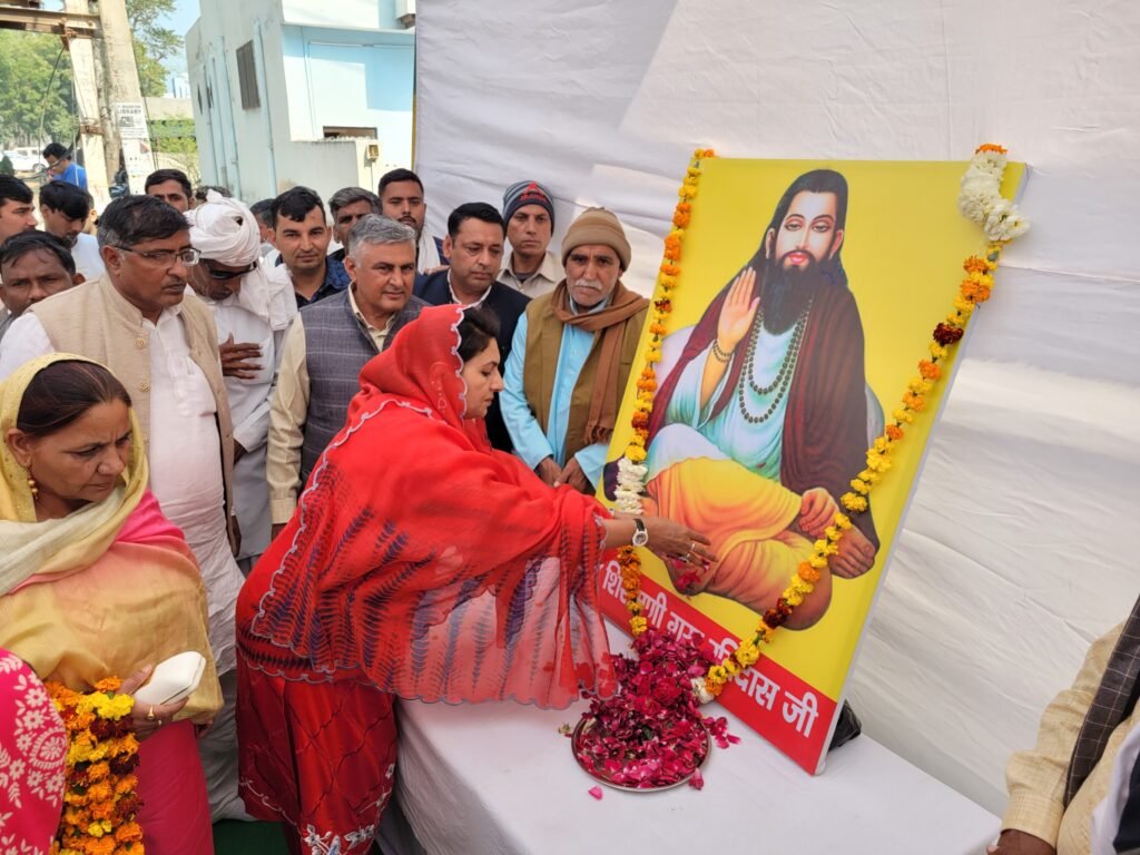 गुरु रविदास जयंती के पावन अवसर पर विधायक नैना चौटाला के आवास पर कार्यक्रम का आयोजन किया गया। कार्यक्रम में नैना सिंह चौटाला गुरु रविदास जी के चित्र पर माल्यार्पण करते हुए पुष्प अर्पित किए। उन्होंने कहा कि हमें सदैव महापुरुषों के दिखाएं रास्ते पर आगे बढ़ते हुए लोक भलाई में कार्य करने चाहिए। गुरु रविदास जयंती के अवसर पर विधायक नैना चौटाला ने अपने निजी कोष से बाढड़ा हल्के के 90 जरूरतमंद व असहाय लोंगो को 9 लाख 70 हजार रुपए सहायता राशि के रुप में वितरित किए। उपस्थित लोगों को सम्बोधित करते हुए नैना सिंह चौटाला ने कहा कि चुनाव के दौरान उन्होंने लोंगो से वायदा किया था कि विधायक के रुप में उन्हे मिलने वाले बजट पर बाढडा हल्के के लोंगो का अधिकार है। इसलिए समय-समय पर हल्के के जरूरतमंद लोंगो की मदद करके उन्हें स्वयं