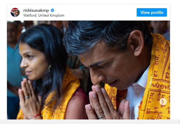 ब्रिटेन/- ब्रिटेन में पीएम पद के उम्मीदवार ऋषि सुनक ने एक बार फिर अपनी प्रबल हिन्दू आस्था को उजागर करते हुए लंदन की एक गौशाला में अपनी पत्नी अक्षता मूर्ति के साथ गौ पूजा की है। उनकी इस पूजा का वीडियो सोशल मीडिया पर खूब वायरल हो रहा है। वीडियो में, दंपति को एक गाय की पूजा अर्चना करते देखा जा सकता है। इससे पहले ऋषि सुनक श्रीकृष्णा जन्माष्टमी पर भी भक्तिवेदांत मनोर मंदिर में पूजा अर्चना करते दिखाई दिये थे।