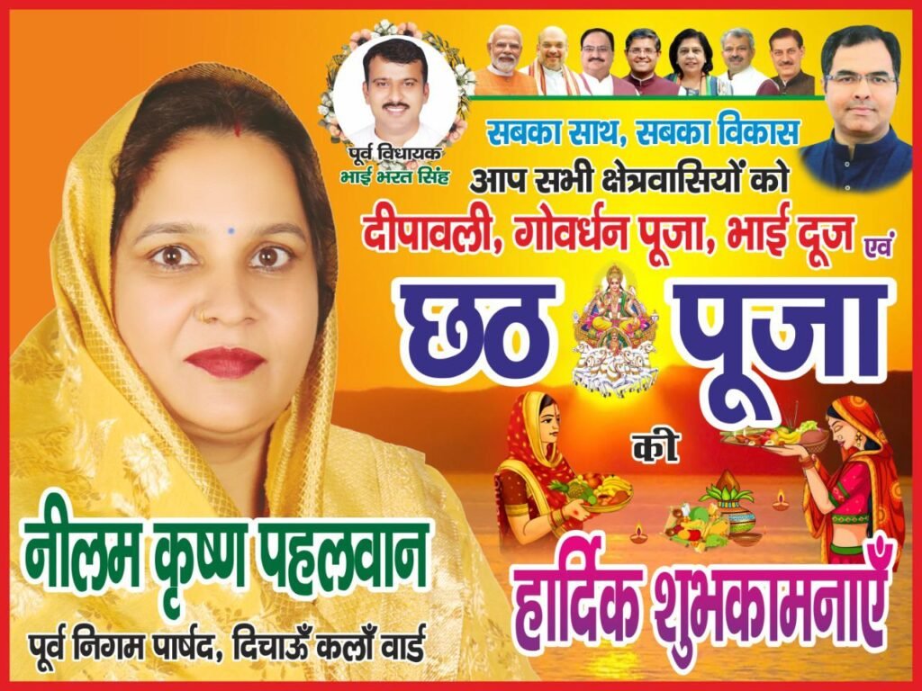 नजफगढ़/नई दिल्ली/- दिचाऊं कलां वार्ड की पूर्व पार्षद एवं भाजपा नेत्री नीलम कृष्ण पहलवान ने प्रदुषण रहित व सुरक्षित दीवाली मनाने का आहवान करते हुए क्षेत्रवासियों को दीपोत्सव दीवाली, गोवर्धन पूजा, छठ पूजा व भाई दूज की सभी को शुभ कामनाऐं दी।