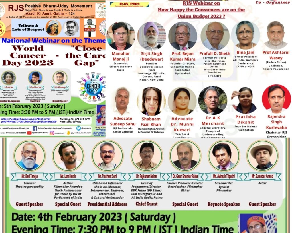आजादी की अमृत गाथा का 124 वां कार्यक्रम इसी दिन संध्या समय में विश्व कैंसर दिवस पर  लेडी हार्डिंग मेडिकल कॉलेज एसोसिएट सुचेता कृपलानी चिल्ड्रेन्स हॉस्पिटल के निदेशक बाल कैंसर रोग विशेषज्ञ प्रो. (डा.) योगेशकुमार सरीन और वरिष्ठ कैंसर रोग विशेषज्ञ डा. सुशील मानधानिया का विश्व कैंसर दिवस 2023 की थीम“क्लोज द केयर गैप“  पर जागरूकता वेबिनार  हुआ। कार्यक्रम का संचालन बीडीएसएल महिला महाविद्यालय, जमशेदपुर की प्राचार्या डॉ पुष्कर बाला ने किया जो इस कार्यक्रम की सह-आयोजक और सकारात्मक भारत उदय सूचना केंद्र की प्रभारी भी हैं। इसमें तिलका मांझी और दीनदयाल उपाध्याय की स्मृति को नमन् किया जाएगा।आरजेएस राष्ट्रीय संयोजक उदय कुमार मन्ना ने बताया कि राष्ट्रीय नाट्य विद्यालय के आगामी भारत रंग महोत्सव के न्यूज़ कवरेज के लिए आरजेएस पॉजिटिव मीडिया-आरजेएस वाणी और आरजेएस पॉजिटिव ब्रॉडकास्टिंग हाउस का स्वैच्छिक समर्थन रहेगा।