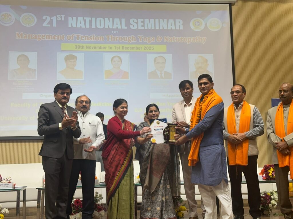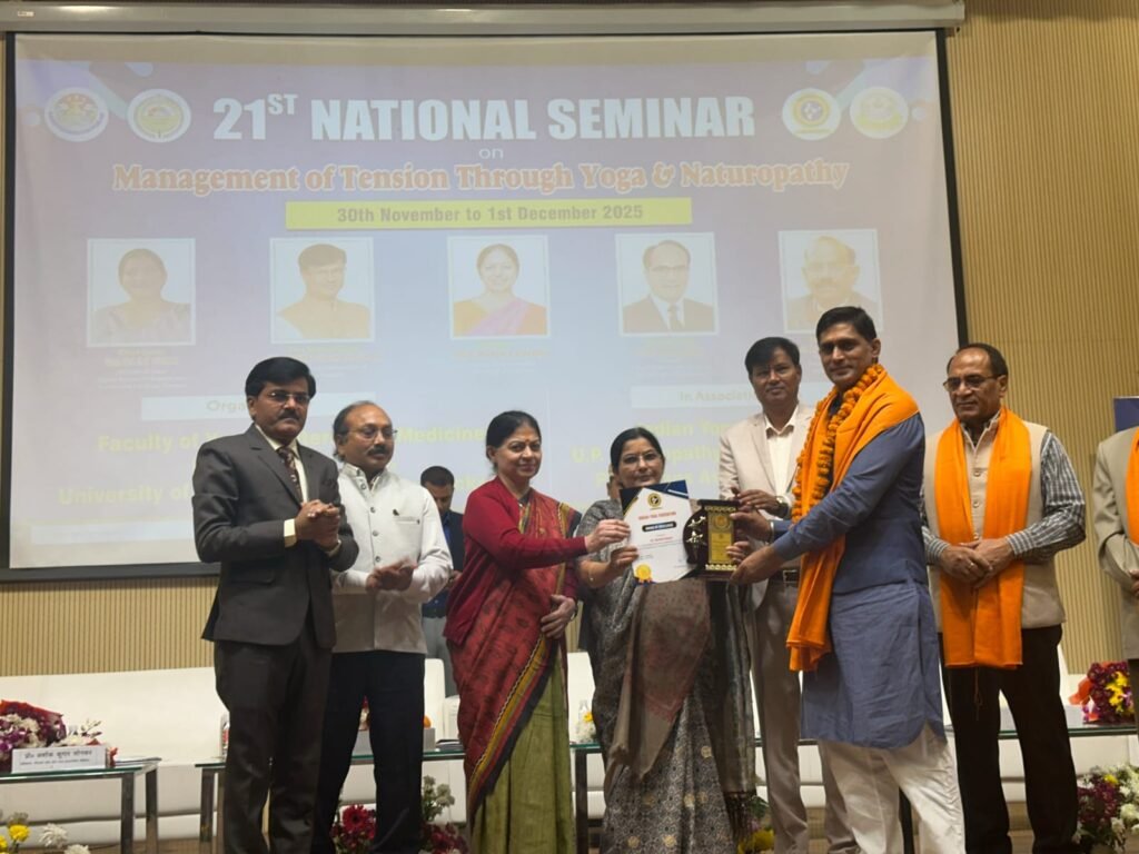 लखनऊ/उमा सक्सेना/- लखनऊ विश्वविद्यालय में आयोजित 21वें राष्ट्रीय सेमिनार के अवसर पर योग क्षेत्र में विशिष्ट योगदान देने वाले डॉ. रमेश कुमार को “अवार्ड ऑफ़ एक्सीलेंस” से सम्मानित किया गया। इस समारोह में मुख्य अतिथि के रूप में उच्च शिक्षा राज्यमंत्री उत्तर प्रदेश सरकार श्रीमती रजनी तिवारी, लखनऊ विश्वविद्यालय की माननीय कुलपति प्रो. मनुका खन्ना, और विधानसभा सदस्य पवन सिंह चौहान उपस्थित थे। डॉ. रमेश कुमार, जो श्री लाल बहादुर शास्त्री राष्ट्रीय संस्कृत विश्वविद्यालय के योग विज्ञान विभाग के समन्वयक हैं, ने योग के क्षेत्र में पिछले 20 वर्षों में अनेक कार्यशालाओं, योग शिविरों और अंतरराष्ट्रीय सम्मेलनों का संचालन किया। उनके नाम 27 राष्ट्रीय और अंतरराष्ट्रीय शोध पत्र प्रकाशित होने के साथ-साथ सात पुस्तकें भी दर्ज हैं। इसके अतिरिक्त उन्हें योग में विश्व चैंपियन का खिताब भी प्राप्त है।