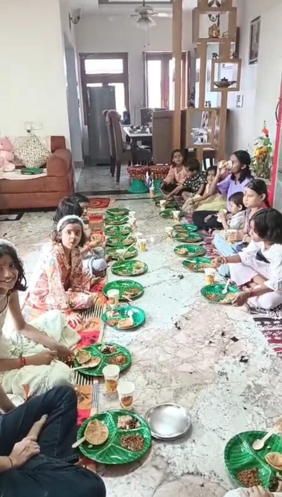 पूजन के बाद कन्याओं को प्रेम और श्रद्धा से भोजन परोसा जाता है। पूड़ी, हलवा, चना और अन्य प्रसाद से सजी थालियाँ जब इन नन्ही कन्याओं के सामने रखी जाती हैं तो वातावरण भक्ति और आनंद से भर उठता है। ऐसा प्रतीत होता है मानो स्वयं देवियाँ भक्तों के घर पधारकर प्रसाद स्वीकार कर रही हों।