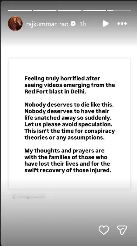 अभिनेता राजकुमार राव ने विस्फोट की खबर सुनकर अपनी इंस्टाग्राम स्टोरी पर पोस्ट शेयर की। उन्होंने लिखा —