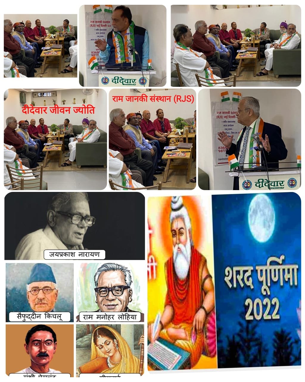 नई दिल्ली/- राम जानकी संस्थान परिवार की तरफ से 95 वीं फिजिकल और वर्चुवल आजादी की अमृत गाथा कार्यक्रम का आयोजन दीदेवार जीवन ज्योति हॉल पटेल नगर दिल्ली में शरद पूर्णिमा और ईद ए मिलादुन्नबी पर आयोजित किया गया। आयोजन विश्व मानसिक स्वास्थय दिवस पर दुनिया और भारत में मानसिक स्वास्थ्य की दशा और दिशा पर किया गया और महापुरुष वाल्मीकि जी, स्वतंत्रता सेनानी जयप्रकाश नारायण,राम मनोहर लोहिया, सैफुद्दीन किचलू, मीराबाई और मुंशी प्रेमचंद आदि को श्रद्धांजलि दी गई।