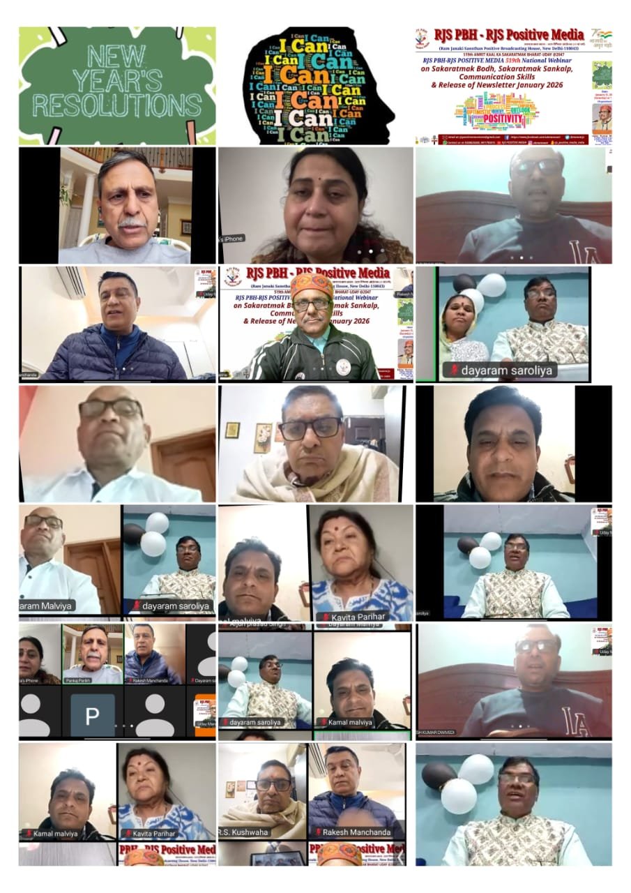 नई दिल्ली/उमा सक्सेना/- राम जानकी संस्थान (आरजेएस) पॉजिटिव ब्रॉडकास्टिंग हाउस (पीबीएच) द्वारा आयोजित 519वें राष्ट्रीय वेबिनार में भारत को स्वतंत्रता के शताब्दी वर्ष 2047 तक एक सशक्त, जागरूक और सकारात्मक राष्ट्र बनाने का व्यापक संकल्प लिया गया। “अमृत काल का सकारात्मक भारत उदय” विषय पर केंद्रित इस वैश्विक संगोष्ठी में संचार कौशल, सकारात्मक सोच और सांस्कृतिक मूल्यों को आधार बनाते हुए 17 बिंदुओं पर आधारित एक विस्तृत कार्ययोजना प्रस्तुत की गई। कार्यक्रम गुरु रविदास जयंती के उपलक्ष्य में आयोजित हुआ, जिसमें सामाजिक चेतना और रचनात्मक मीडिया की भूमिका पर विशेष चर्चा की गई।