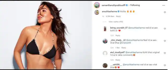 दरअसल सामंथा के हॉट फोटो पर फैन्स ने खूब प्यार लुटाया था और उनकी तारीफ की थी। सामंथा की तस्वीर पर अनुष्का ने भी कमेंट करते हुए हॉटी (भ्वजजपम) लिखा था। देखते ही देखते अनुष्का का कमेंट भी वायरल हो गया, जिसके बाद सोशल मीडिया यूजर्स अनुष्का के पति व क्रिकेटर विराट कोहली के मजे लेने लगे। अनुष्का के कमेंट के रिप्लाई में कई सोशल मीडिया यूजर्स ने कमेंट किया है कि विराट भाई अपने रियल आईडी से कमेंट करो। मजाक मजाक में सोशल मीडिया यूजर्स ये कह रहे हैं कि विराट ने ही अनुष्का की आईडी से सामंथा की तस्वीर पर कमेंट किया है।