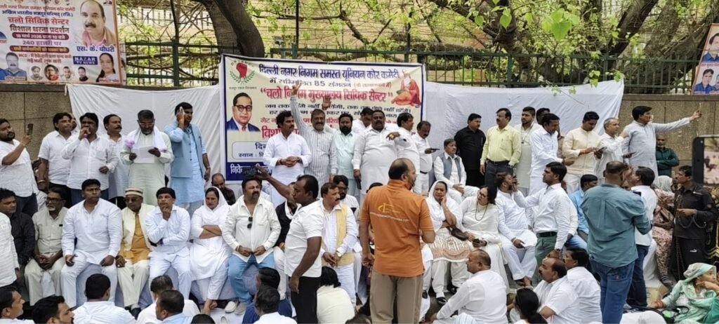 नई दिल्ली/उमा सक्सेना/- राजधानी दिल्ली के सिविक सेंटर स्थित एमसीडी मुख्यालय के बाहर शुक्रवार को सफाई कर्मचारियों का बड़ा प्रदर्शन देखने को मिला, जहां सैकड़ों की संख्या में जुटे कर्मियों ने निगम प्रशासन के खिलाफ जमकर नारेबाजी की। कर्मचारियों ने अपनी लंबित मांगों को लेकर गहरी नाराजगी जताते हुए कहा कि वे लंबे समय से अपनी समस्याओं को प्रशासन के सामने रखते आ रहे हैं, लेकिन अब तक कोई ठोस समाधान नहीं निकला है। मजबूरी में उन्हें सड़कों पर उतरकर विरोध प्रदर्शन करना पड़ रहा है।