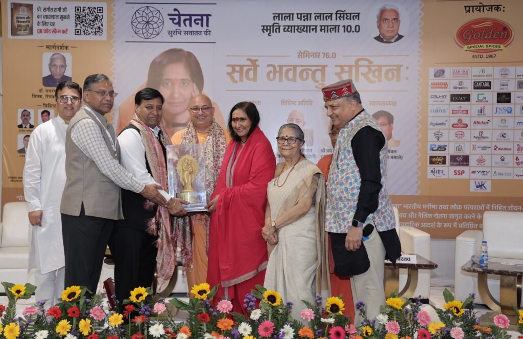नई दिल्ली/उमा सक्सेना/- नई दिल्ली के रोहिणी सेक्टर-25 स्थित इस्कॉन मंदिर में रविवार को एक विशेष आध्यात्मिक सेमिनार का आयोजन किया गया। यह कार्यक्रम संस्था ‘चेतना’ (सुरभि सनातन की) द्वारा लाला पन्नालाल सिंघल स्मृति व्याख्यानमाला के अंतर्गत आयोजित किया गया। इस अवसर पर आयोजित 76वें सेमिनार में मुख्य वक्ता के रूप में पद्मभूषण सम्मानित साध्वी ऋतंभरा ने शिरकत की। अपने ओजस्वी और भावपूर्ण संबोधन में उन्होंने भारतीय संस्कृति के मूल विचार “सर्वे भवन्तु सुखिनः” की महत्ता पर विस्तार से प्रकाश डाला।