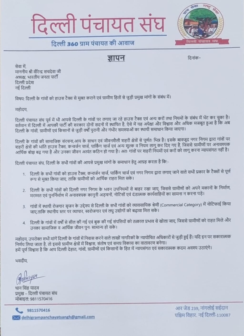 दिल्ली पंचायत संघ ने स्पष्ट रूप से मांग की है कि राजधानी के सभी गांवों को हाउस टैक्स सहित नगर निगम के सभी प्रकार के करों से पूरी तरह मुक्त किया जाए। साथ ही गांवों को दिल्ली नगर निगम के भवन उपनियमों से बाहर रखा जाए, ताकि ग्रामीणों को अनावश्यक कानूनी कार्रवाई का सामना न करना पड़े। पंचायत संघ ने गांवों में रोजगार के अवसर बढ़ाने के लिए सभी गांवों को व्यावसायिक श्रेणी में अधिसूचित करने और वर्षों से सील या बुक की गई संपत्तियों को तत्काल खोलने की भी मांग की है।