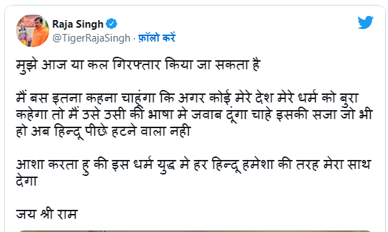 अब टी राजा सिंह ने नया वीडियो जारी किया। अपने नए वीडियो में राजा सिंह के तेवर बरकरार हैं। वीडियो के कैप्शन में राजा सिंह लिखते हैं, “मुझे आज या कल गिरफ्तार किया जा सकता है। मैं बस इतना कहना चाहूंगा कि अगर कोई मेरे देश मेरे धर्म को बुरा कहेगा तो मैं उसे उसी की भाषा मे जवाब दूंगा चाहे इसकी सजा जो भी हो अब हिन्दू पीछे हटने वाला नहीं। आशा करता हुं कि इस धर्म युद्ध मे हर हिन्दू हमेशा की तरह मेरा साथ देगा। जय श्री राम“