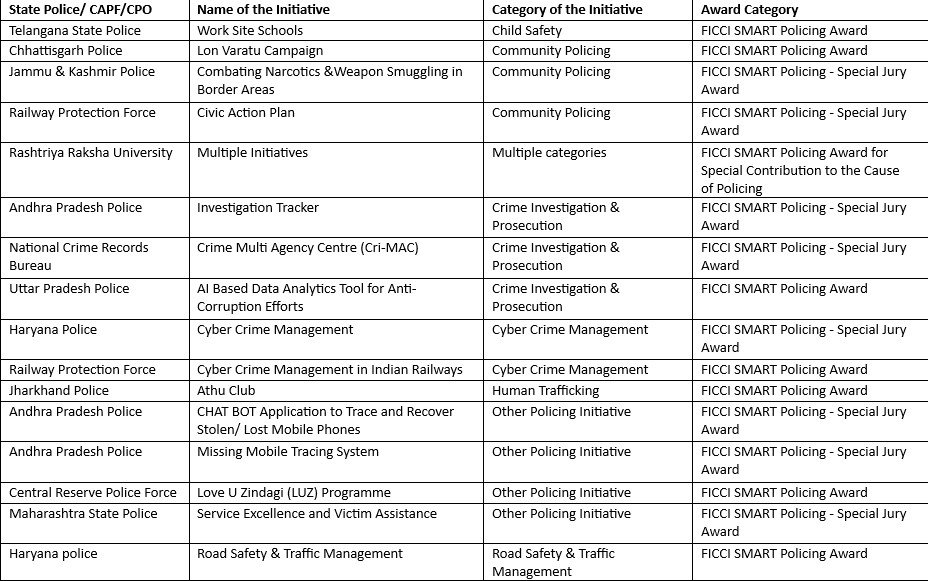 कॉन्फ्रेंस का मुख्य आकर्षण प्रतिष्ठित FICCI स्मार्ट पुलिसिंग अवार्ड्स की प्रस्तुति थी। ये पुरस्कार होमलैंड सिक्योरिटी और पुलिसिंग के क्षेत्र में राज्य पुलिस विभागों, केंद्रीय सशस्त्र पुलिस बलों (सीएपीएफ) और केंद्रीय पुलिस संगठनों (सीपीओ) के उल्लेखनीय योगदान के लिए दिए गए। ये पुरस्कार हमारे देश की सुरक्षा में इन संगठनों के समर्पण और इनोवेशन को मान्यता दिलाने के लिए दिए गए।